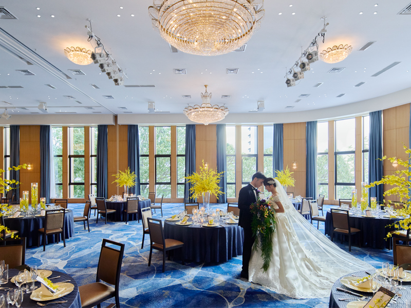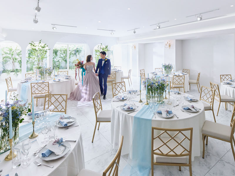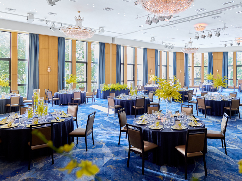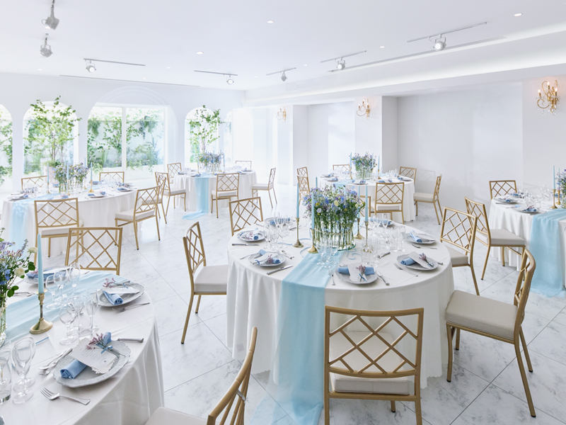 日本一長い武蔵一宮氷川神社の参道を一面の窓から眺められる「飛龍」深いブルーとクリアなホワイトの空間に、シャンデリアが煌めきます。ノーブルな大空間は人数に合わせてその姿を自在に変えます。