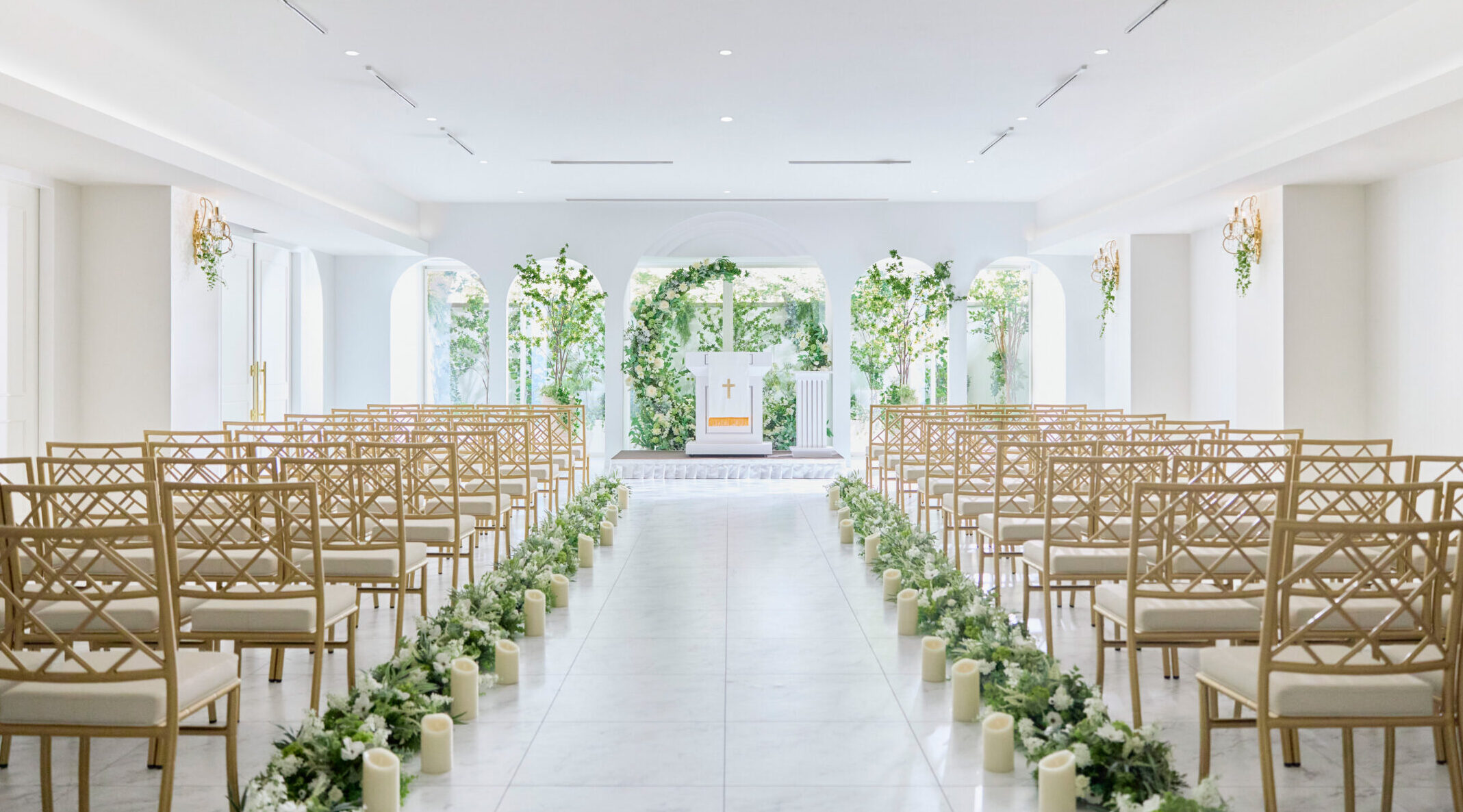 ホワイトを基調としたナチュラルチャペルに調和する清楚な空間。